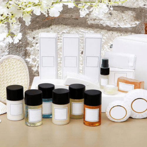 Box amenities with 30 m l bottles with black cap